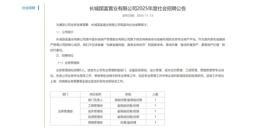 中国长城资产管理公司旗下的长城国富置业有限公司,2025年11月发布社会招聘公告,招募方向聚焦房地产开发管理全链条,原则上应具有3年以上相关工作经验,具有大型地产开发企业、相关领域知名企业工作经历者优先。