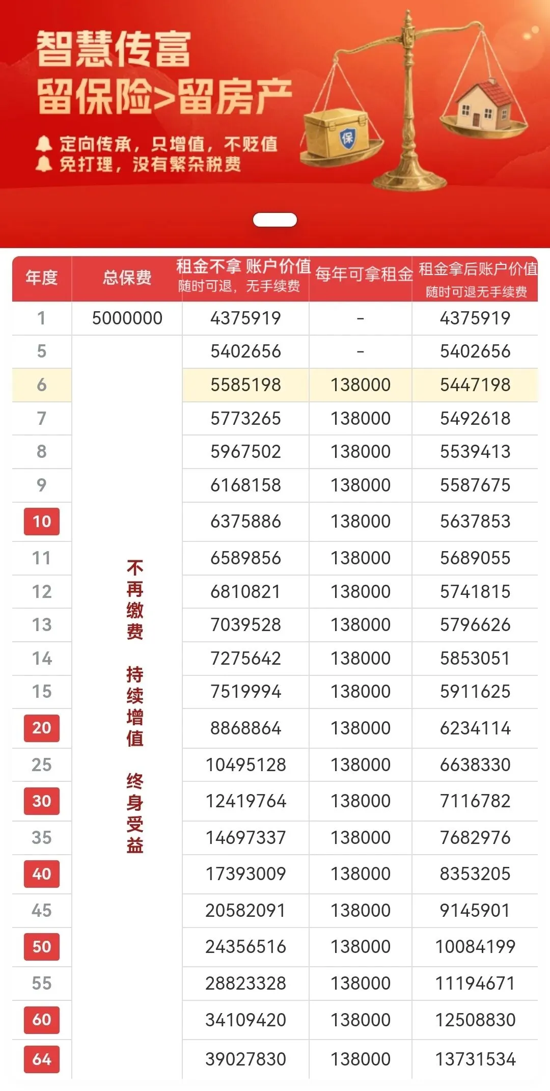 收益对比:如案例一投入房产价值的一半(500万)至保险金融工具,从第6年起每年领取13.8万(等同房租),同时账户价值持续增长。