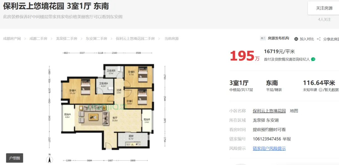 2026年01月17日,据市场端消息:成都龙泉驿东安湖,保利云上悠境花园建面117平套三报价195万;目前房东心里价在195万愿意出售。
