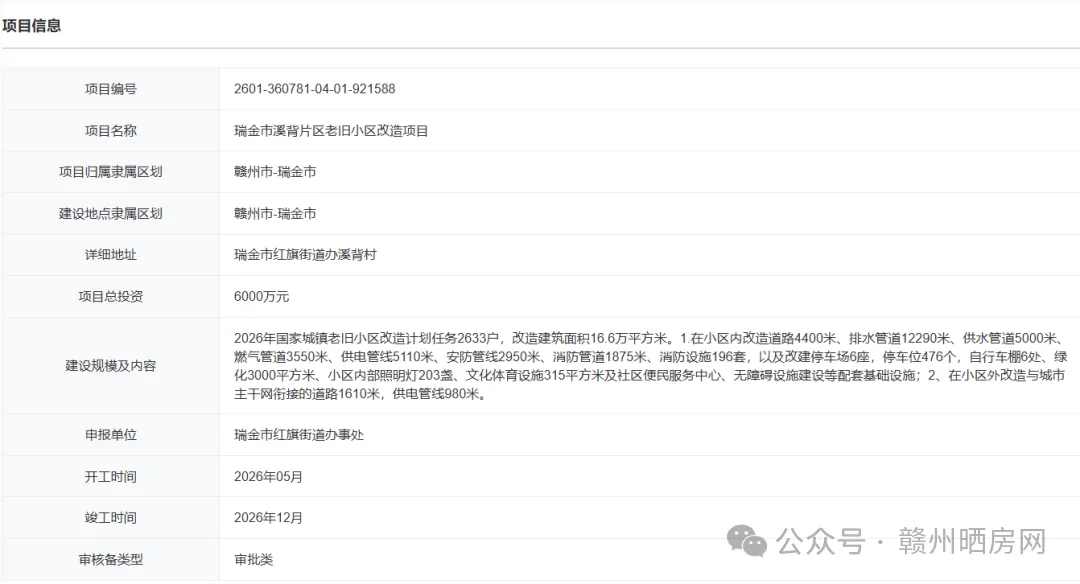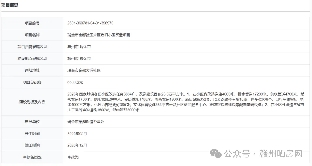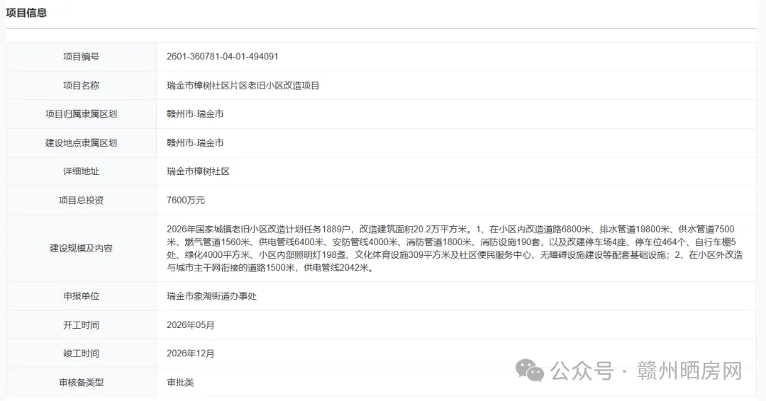 根据资料显示:项目由瑞金市红旗街道办事处申报,计划开工时间2026年05月,竣工时间2026年12月。