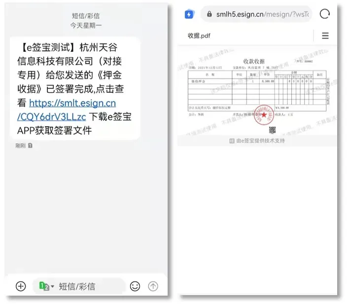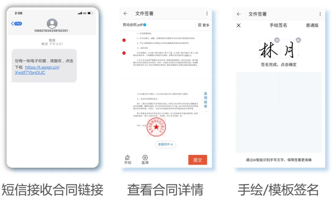 可通过手机短信、企业服务号、e签宝小程序等渠道,接收待签署的合同链接,随时随地预览合同并进行签署。