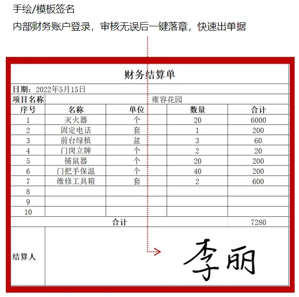 可将e签宝服务接入内部业务系统,无论是业主服务开具收据,还是日常办公流程需要单据记录,都可以在完成业务数据的核对后,一键合成单据并自动盖章,操作简单且更加合规。