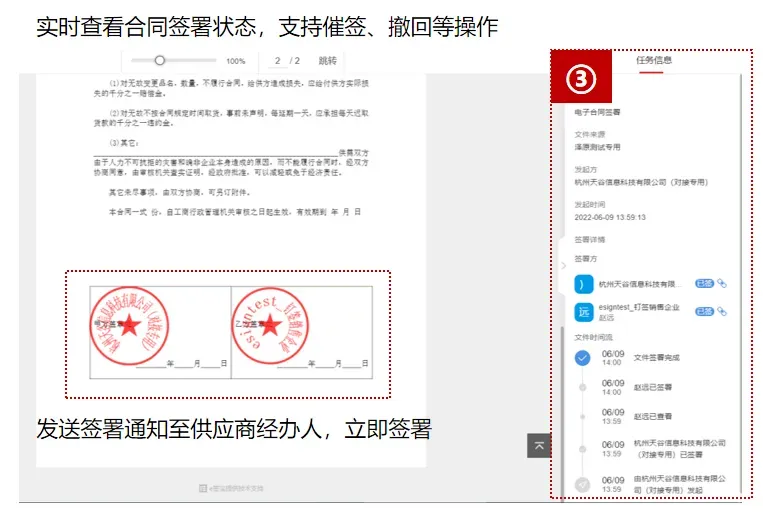 永升物业与e签宝深度合作,不仅将内部组织、成员、印章进行电子化管控,同时将电子签章服务应用的外部业务,如供应、采购等业务场景,实现内外一体化智能签署。