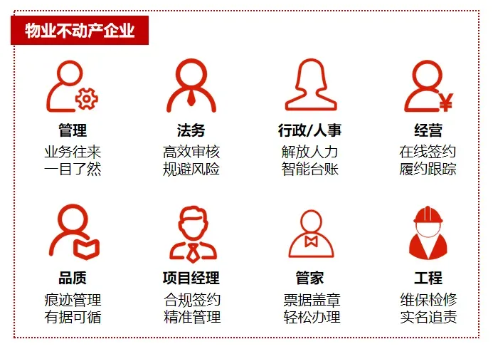 物业不动产行业在内部经营与业主服务过程中,涉及到大量的合同、文件签署,如采购、施工、房屋买卖、房屋/车辆/物业租赁与管理、集团内部人事管理等业务场景。传统的纸质合同签署流程繁琐,效率低下,还容易出现私刻印章的行为。