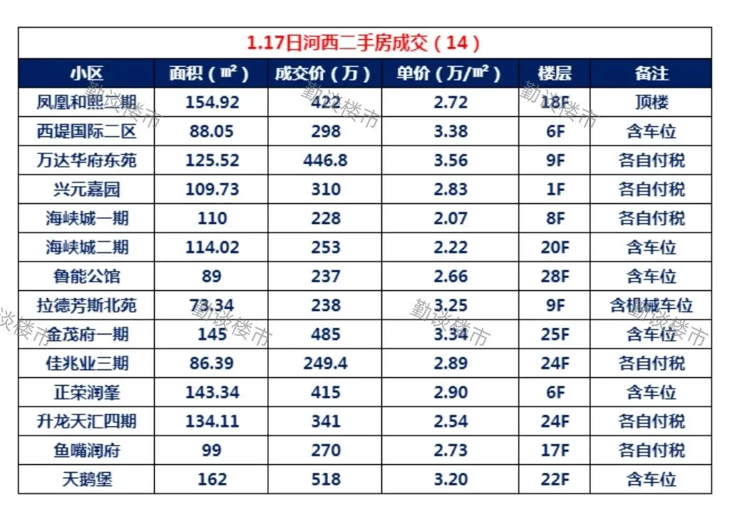 1.17河西二手房成交数据相当不错,共计成交14套,河西中成交5套,河西南成交9套。佳兆业三期87平米,成交价249.4万,价格非常不错,最近2套价格都在250万左右,价格呈明显上涨趋势,本月该小区已经成交12套,遥遥领先于其他楼盘。正荣润峯这两天成交了2套143平米的6楼,价格都差不多,本月正荣润峯已经成交了7套二手房,数据相当可观。海峡城昨天成交2套,本月成交8套,继续保持成交热度;金茂府成交也不错,本月已经成交6套。