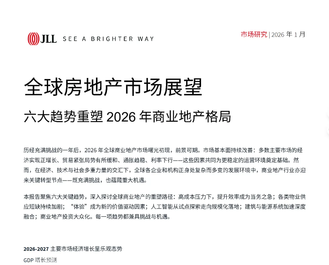 仲量联行研究部2025年发布的《全球房地产市场展望:六大趋势重塑2026年商业地产格局》重磅指出,2025下半年回暖的房地产资本市场将在2026年持续升温,债务市场活跃、投资者竞购激烈,而真正决定胜负的,早已不是传统地段逻辑,而是六大相互关联的核心趋势。