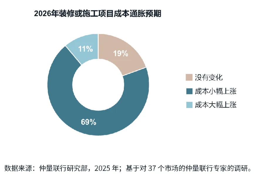 先看最扎心的现实:成本压力已经压垮不少玩家。图1(2026年装修或施工项目成本通胀预期,研报第2部分)清晰显示,69%的项目将面临成本大幅上涨,仅11%能维持不变,19%小幅上涨。背后是三重压力:政府财政问题传导至融资成本、劳动力短缺推高用人成本、建筑原材料价格飙升——英德建造成本通胀率2.7%-3%,美国3.5%-4%,新加坡和澳大利亚更是高达5%-6%。这也难怪72%的企业房地产负责人,把“成本控制与预算效率”当成2026年首要任务。
