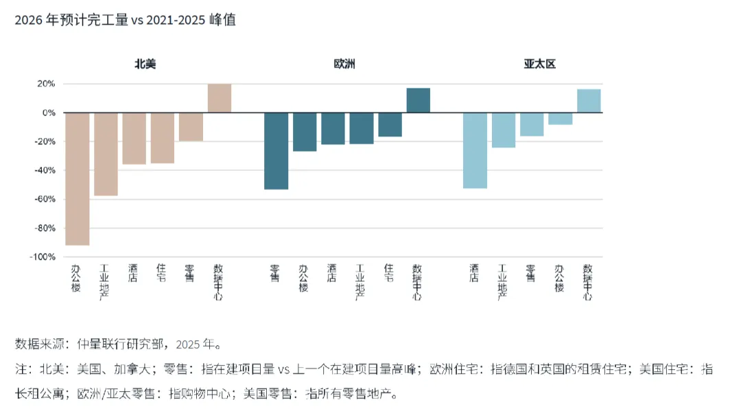 供应端的分化更极端。图2(2026年各类物业供应量对比,2026 vs 2021-2025,研报第3部分)显示,工业及物流地产新增供应较2023年峰值降42%,美国长租公寓开发量下滑超四分之三,成熟市场零售物业供应接近历史最低;但数据中心新增供应逆势增长19%,成为唯一的“供应明星”。反映到市场上,东京、纽约、伦敦等城市优质办公空间“一房难求”,租户要么接受更高租金,要么转向非核心区域。