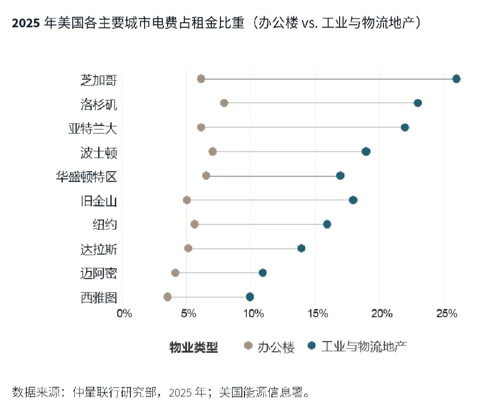 能源革命正在重构资产价值。图4(2025年美国各主要城市电费占租金比重,研报第8部分)显示,部分市场能源成本最高占租金的26%,而数据中心电力需求2025年增长21%,2030年将至少翻倍。但危机也是机遇:美国加州、德国等地的屋顶光伏和储能系统快速普及,中国业主加速部署太阳能设施,整合能源解决方案的资产,综合收益能比传统租金高25%-50%。