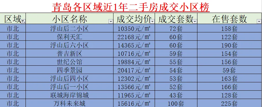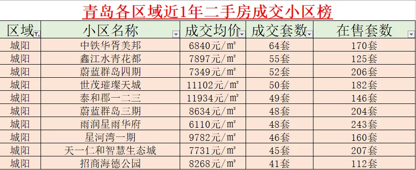 市北区的成交主力集中在 “刚需 + 刚改” 板块:万科未来城以 100 套坐稳区域头把交椅,15616 元 /㎡的均价适配刚改需求;浮山后二小区(72 套)、浮山后六小区(60 套)等 “老小区” 也持续走量,学区 + 成熟配套是核心优势。【城阳区:刚需盘扎堆走量,中铁华胥美邦卖 64 套】