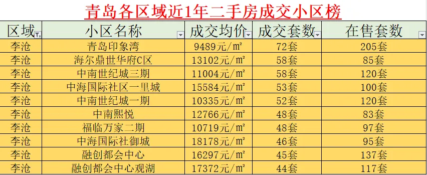 城阳是青岛刚需的 “大本营”,中铁华胥美邦以 64 套登顶,6840 元 /㎡的均价几乎是主城最低门槛;鑫江水青花都(55 套)、蔚蓝群岛四期(52 套)等小区紧随其后,低总价 + 大盘配套,是新青岛人的热门选择。【李沧区:青岛印象湾领跑,刚改盘成主流】