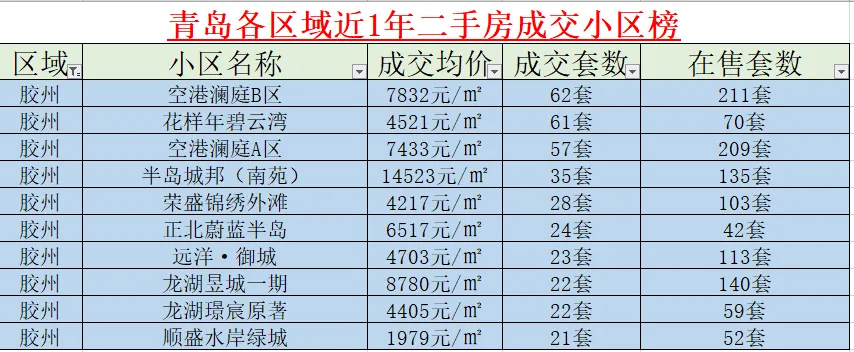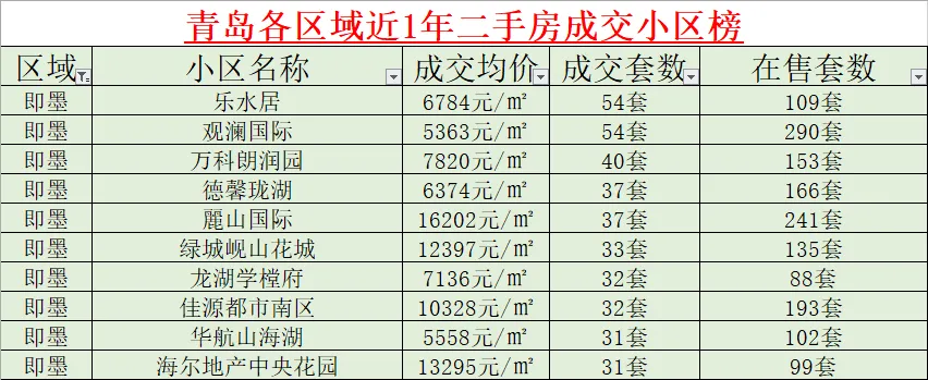 市南作为青岛的 “核心老城区”,成交以高端盘为主:华润中心悦府以 29 套登顶,35129 元 /㎡的均价是主城天花板;伏龙路、锦绣华城一期等小区,凭借 “老市南 + 学区” 属性,也收获了小众改善客群的青睐。【即墨 + 胶州:刚需盘平分秋色,54 套小区成区域主力】