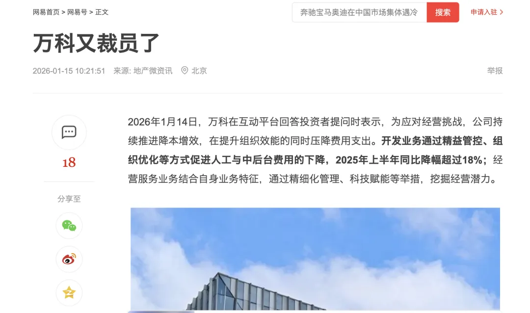 值得注意的是,裁员并未局限于财务风险已暴露的企业。部分经营相对稳健的房企同样在主动收缩编制,反映出行业对中长期增长空间的重新定价。多名分析人士认为,未来房地产企业的竞争,将更多集中在现金流管理、存量资产运营和专业化服务能力上,而非规模和速度。