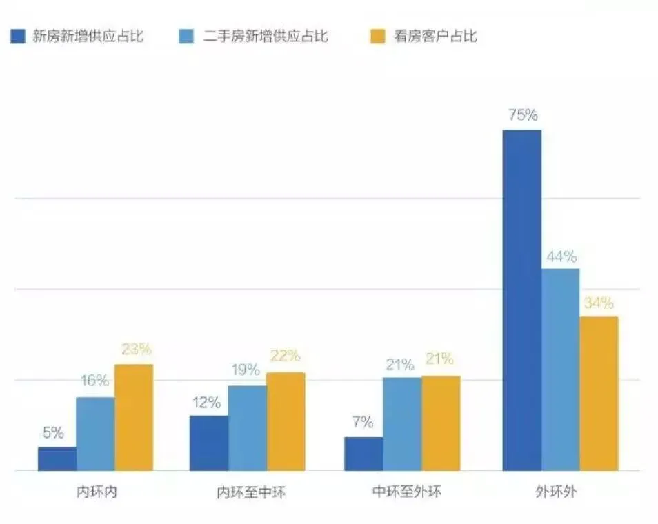 你可以看到,供应最旺盛的外环外,需求的比例反而不多,所以如果你的房子是在外环外,那么本质上你是非常弱势的。因为竞争对手很多,二手房最集中,一手房也在持续不断入市。