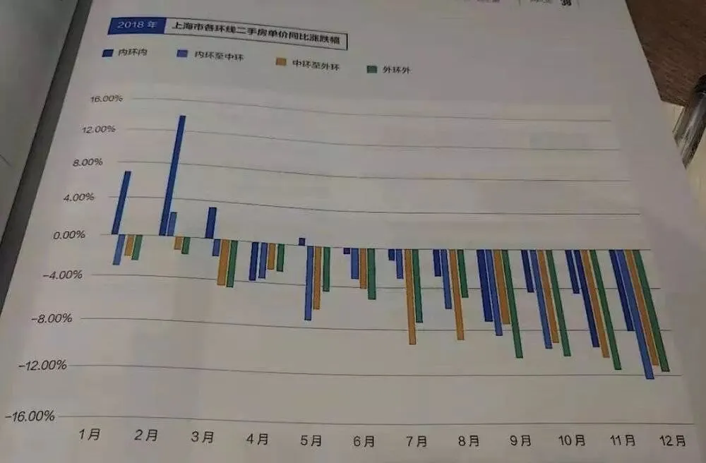 这是2018年下半年的时候,上海不同环线的二手房价格下滑情况,绿色是外环外的楼盘,你可以看到是往下最长的那一条。