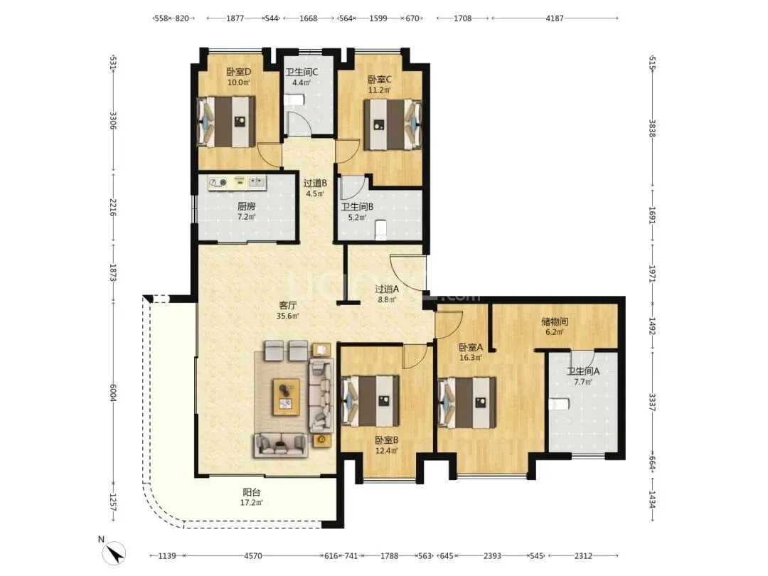 龙湖天奕,建面约197平的户型,二手房挂牌价仅495万,