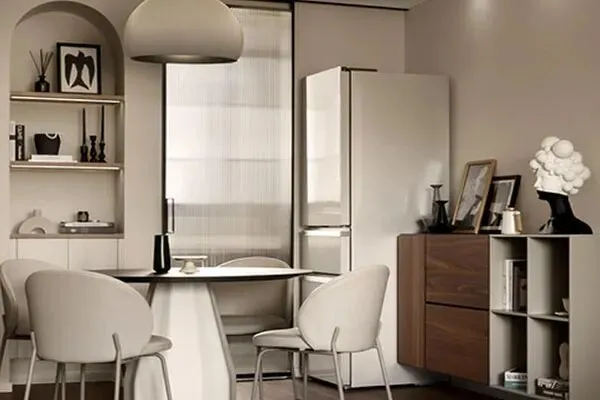 来的了厨房空间。厨房是这个家的烟火聚集地。在这间方寸的厨房里,设计师Sunny以现代简约风格为主,将简致的橱柜里,无缝嵌入了智能厨电,在视觉上进行了完美的统一。踏入这间厨房的时候,丝毫感受不到它的拥挤,有的是便捷舒适的体验。在这个麻雀虽小,但一应俱全的厨房里,一半烟火寻常,一半诗意烂漫。人们常说:“如果你想把生活过得风生水起的话,那么,你就要有一颗被人间烟火浸润的心灵了。”而这间厨房,恰恰印证了这句话。这间小巧的厨房,它如同家的点睛一笔,它俨然宣告了家的舒适感,在这里,烟火气浓郁,Joyce在为自己的生活在厨房逗留的时候,她也感悟到生活的百滋百味了。