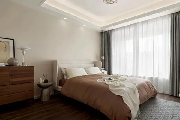 移步到了卧室空间。这间卧室的面积不算小。设计师Sunny承袭了空间的风格调性,以现代简约风为主。在一张舒展的大床,简练的橱柜之中,与秀丽大床床头柜,一并组合成了这个现代温情的卧室空间了。在这一派风华的卧室里,一切变得刚柔并济,兼收并蓄了。好似让人暂别了都市喧嚣,在此尽享和谐之感,在柔韵典雅之间,倍感生活的温度,疲劳感悄然褪去了,留下了一种松弛与惬意,让人浅尝尚佳,这个空间里饱含着家的无限风情了。
