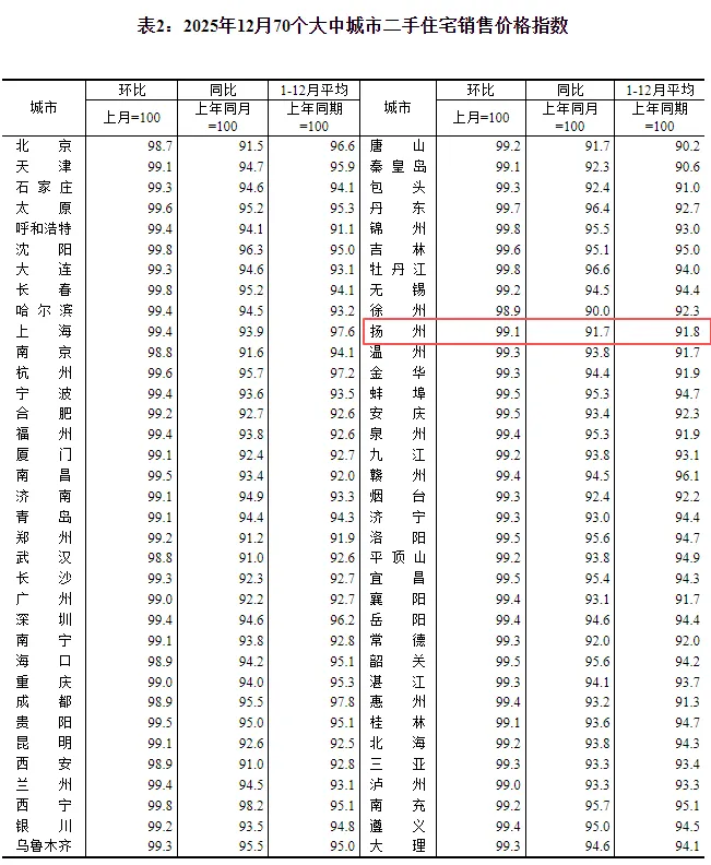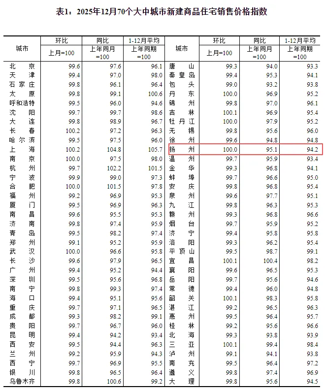 数据显示,12月扬州新建商品住宅价格环比持平,同比下跌4.9%,二手房住宅价格环比下跌0.9%,同比下跌9.3%。