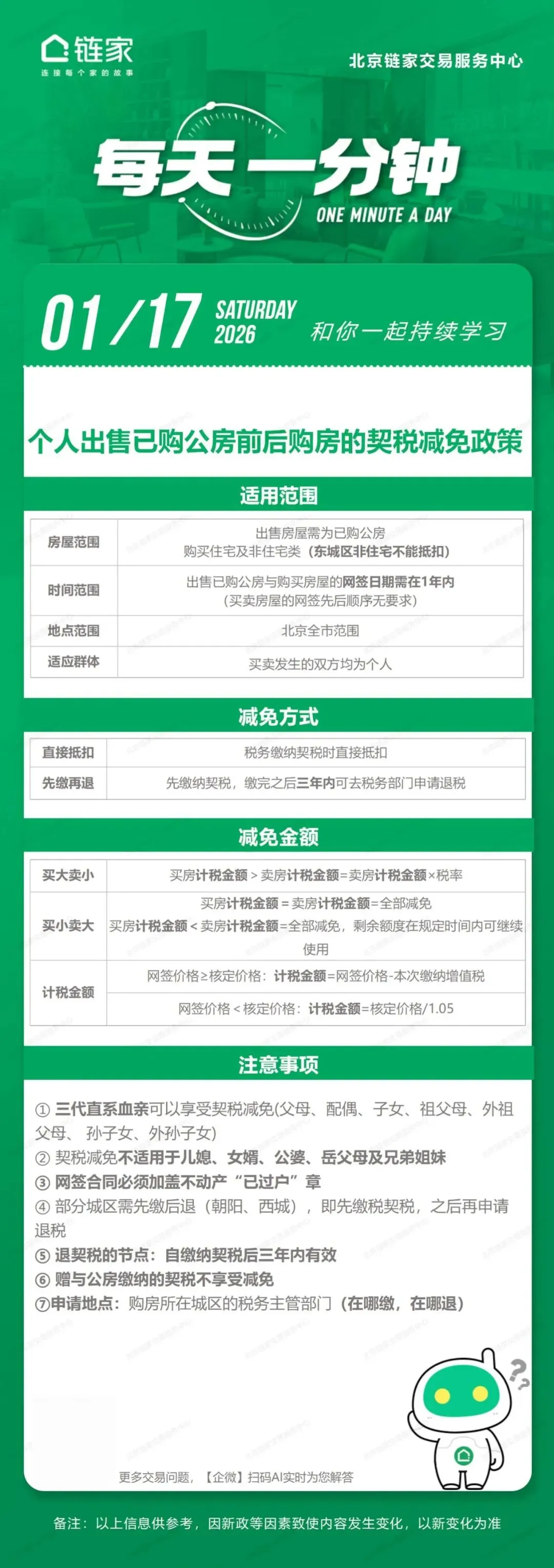 在2026年的北京房产市场,政策的细微调整都可能影响购房者的决策和钱包。今天,链家就为大家带来一个超实用的政策解读——个人出售已购公房前后购房的契税减免政策,帮你在房产交易中合理省钱,轻松置业~一、政策适用范围:明确交易边界
