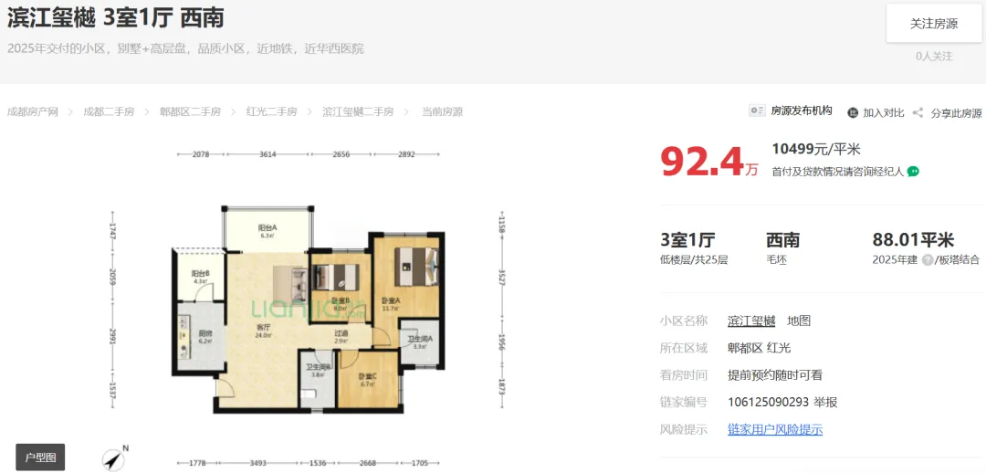 2026年01月19日,据市场端消息:成都郫都红光,滨江玺樾建面88平套三报价92万;目前房东心里价在92万愿意出售。
