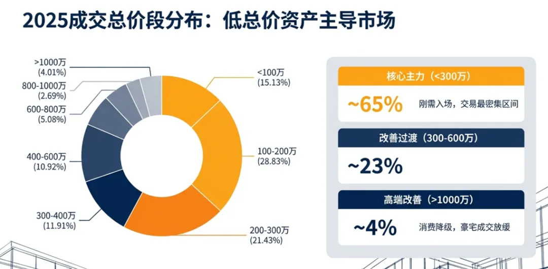 不是房东变乐观了,而是可让步的空间,正在被消耗殆尽。当越来越多房东选择“卖不掉就算了”,市场就从单边下行,进入了博弈阶段。•成交结构:目前上海市场由低总价刚需驱动,2026年1月上半月,上海300万以下房源成交占比升至64.8%。这种由刚需夯实基底的现象,通常是市场筑底的早期特征。03