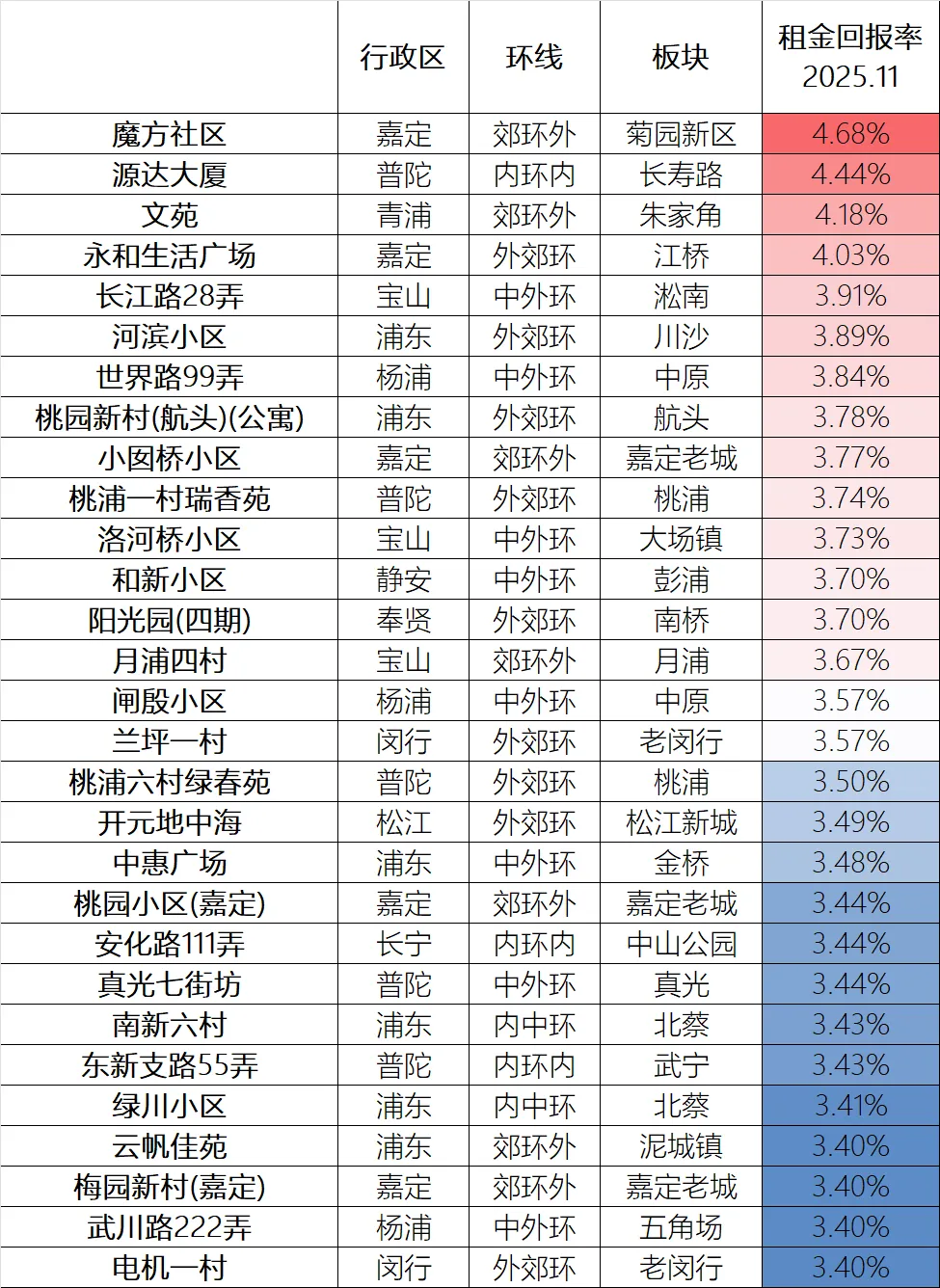 房价触底的标志之一是租金回报率回升并超过按揭贷款利率或长期国债收益率。国际经验:参考香港(2003年)和东京(2005-2012年)的历次见底经验,租金回报率通常需要升至4%-6%,且高于当时的利率水平,市场才会真正企稳并开启长牛。当前情况:目前上海的平均租金回报率约为1.8%,而最低按揭利率约为3%,30年期国债利率约为2.3%,。整体来看:租金回报率与按揭利率之间仍有30%至40%的差距。这意味着若要达到收支平衡的理论底部,房价可能还将继续回落。个别房源的租金回报率,已接近3%–4%,显示出触底特征。04