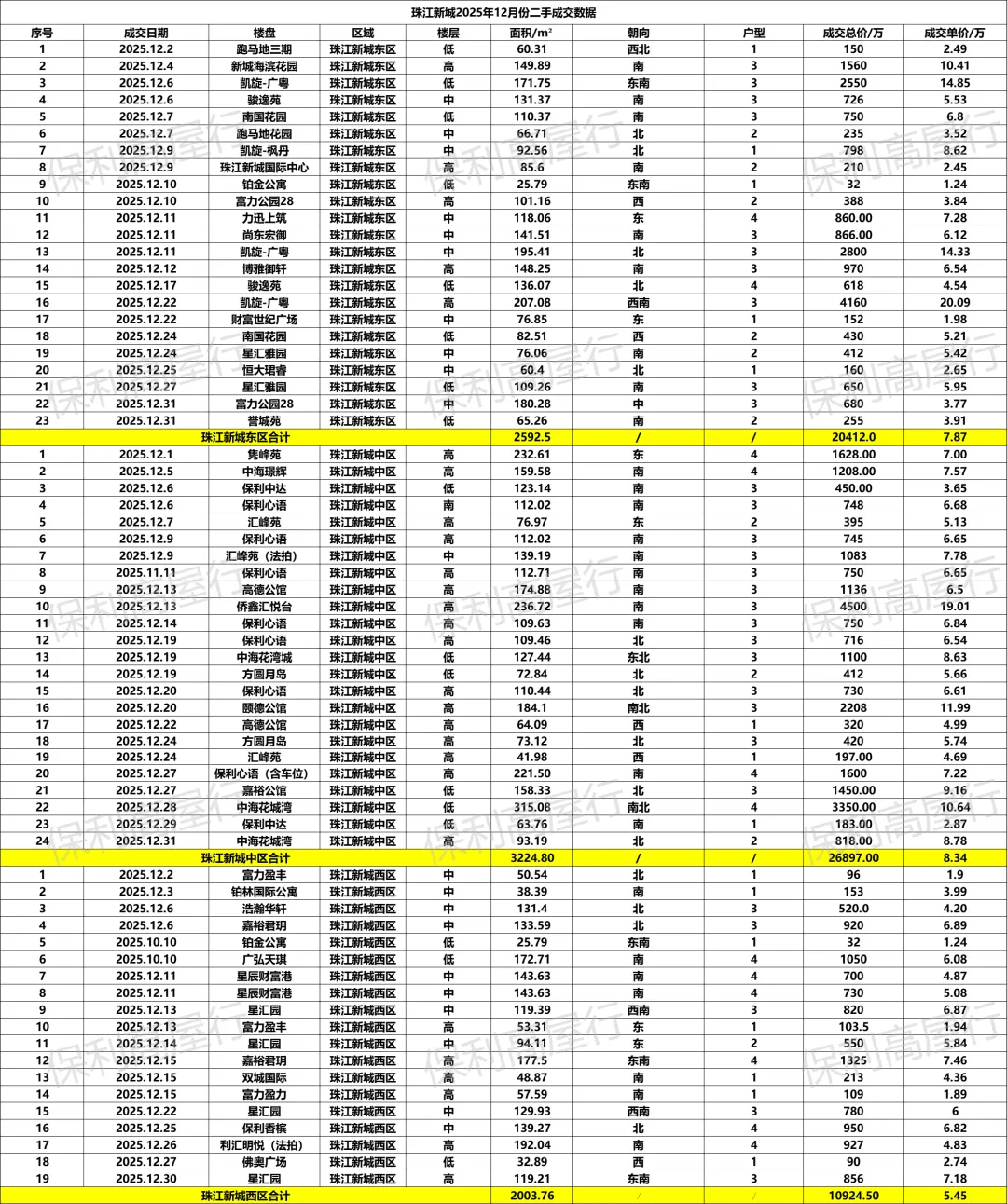 >高屋资讯:珠江新城二手房2025年12月成交数据