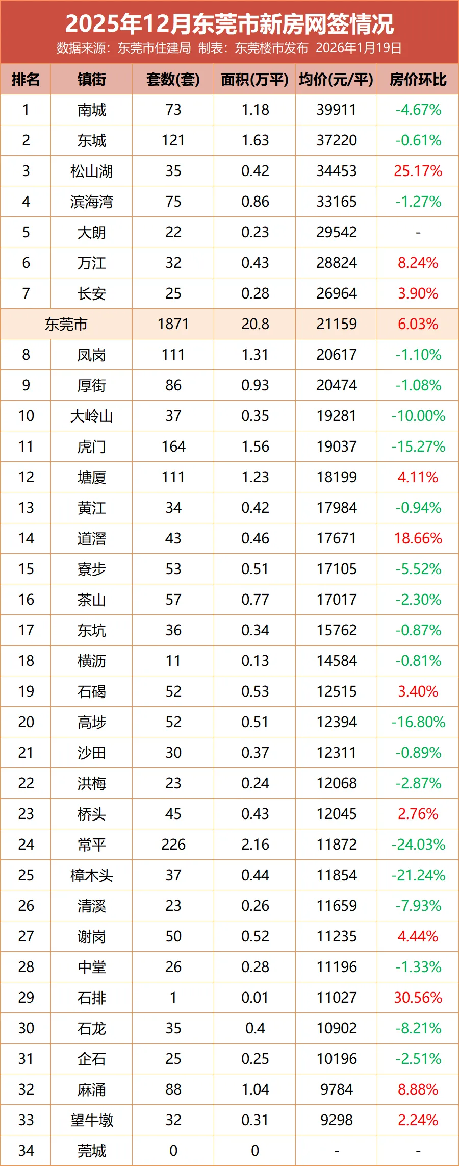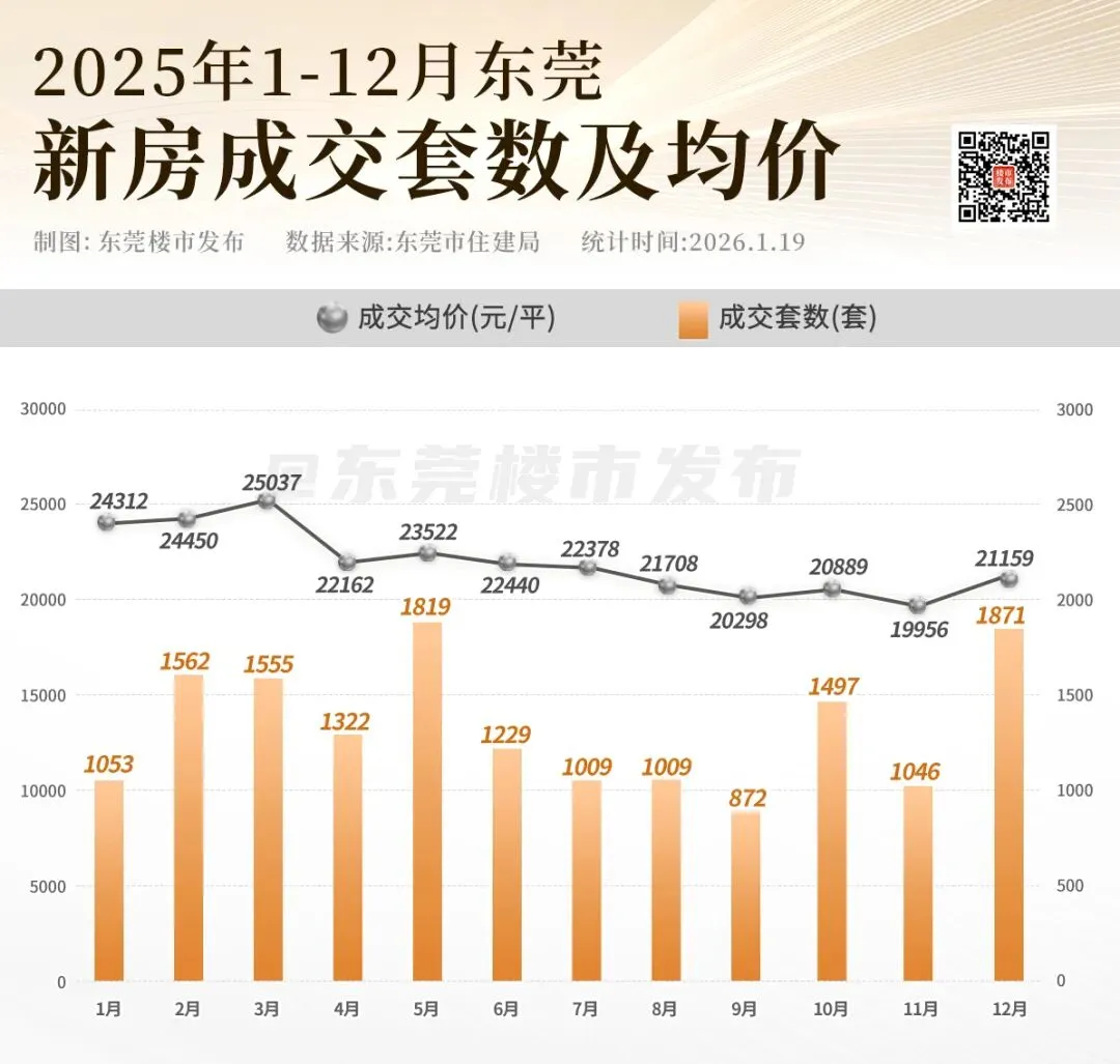 据市住建局数据显示,2025年12月,东莞新房成交1871套,比上月多了825套,环比上涨80%。价格方面,12月的新房成交价格为21159元/平,较上月上涨6.03%。整体而言,12月东莞成交量大涨,是2025年成交量最高的一个月。价格方面,新房均价与8月份相当。|东莞楼市发布制