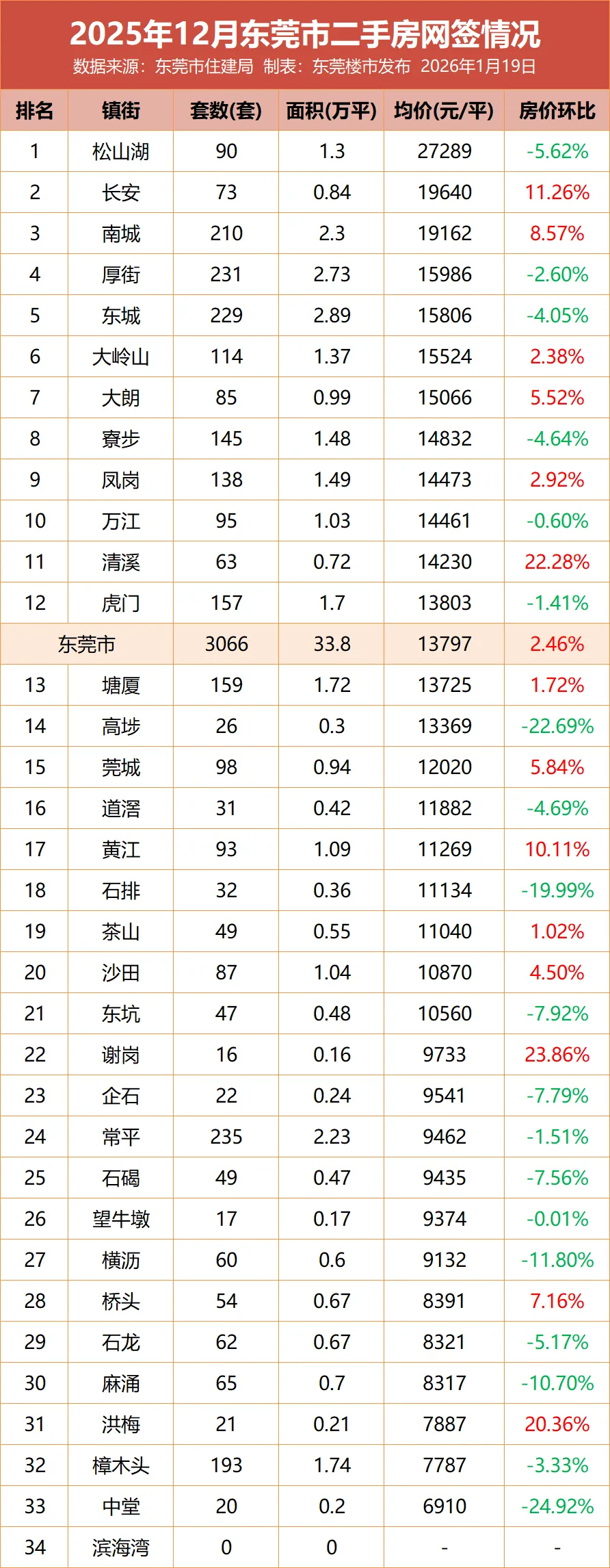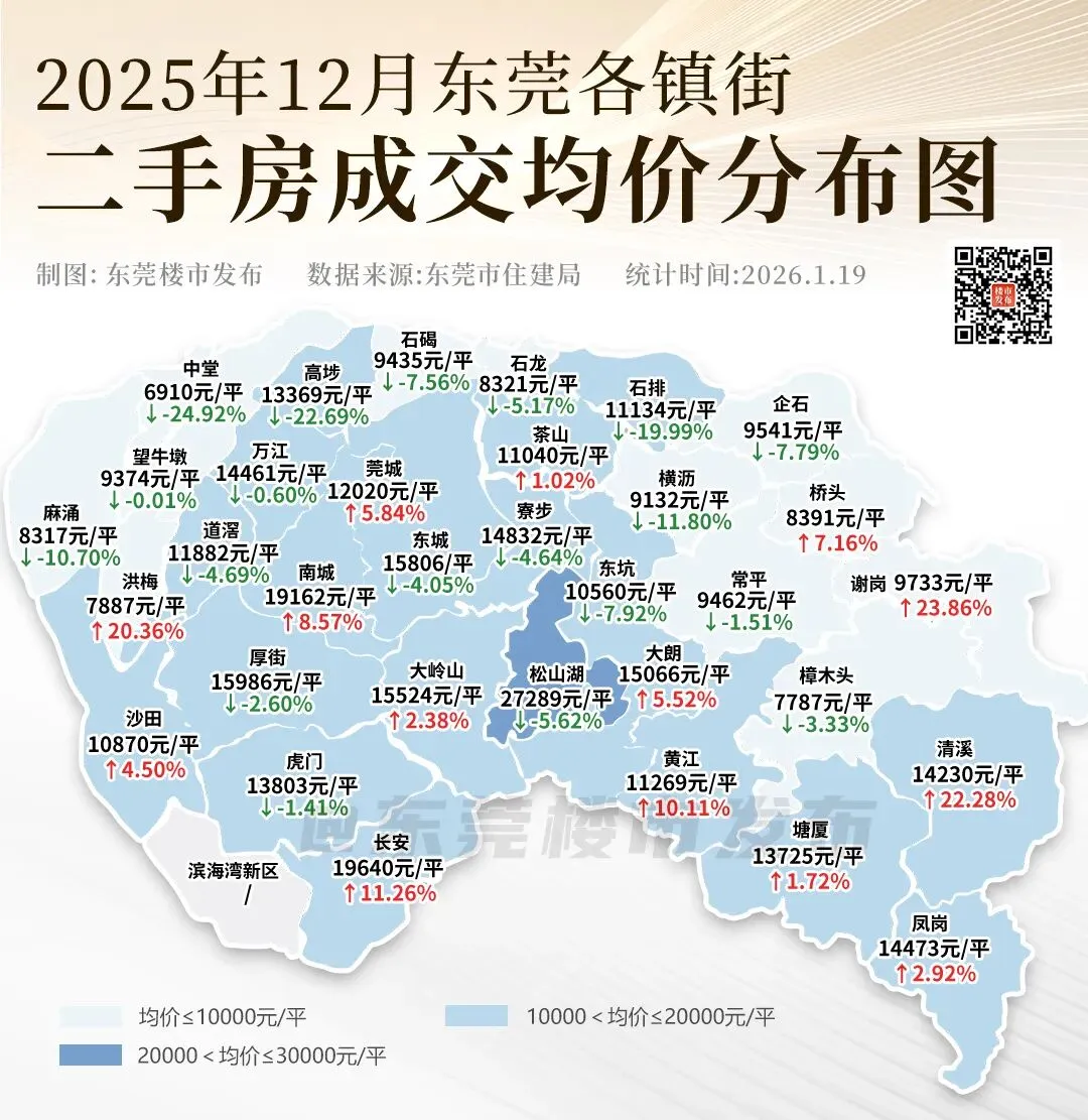从成交价格来看,全市仅松山湖房价在2字头,均价27189元/平,环比下降5.62%。长安超越南城排名第二,均价19640元/平;南城以19162元/平的价格位居第三。目前,东莞除松山湖之外,其余32个镇街的二手房价均已在1字头,有12个镇街均价跌破万元。|东莞楼市发布制图