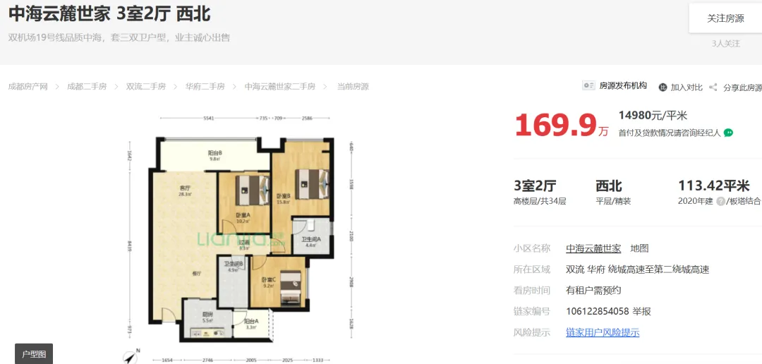 2026年01月19日,据市场端消息:成都双流华府,中海云麓世家建面113平套三报价170万;目前房东心里价在170万愿意出售。
