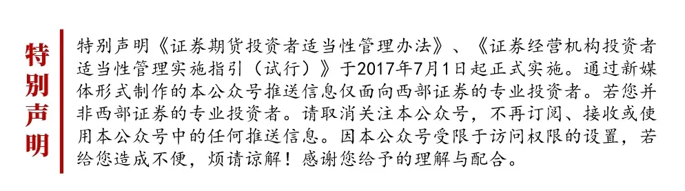 本公众号推送内容仅面向西部证券股份有限公司(以下简称“西部公司”)机构客户,请勿对本公众号内容进行任何形式的转发。若您并非西部证券机构客户,请取消关注本公众号,不再订阅、接收或使用本公众号中的内容。因本公众号难以设置访问权限,若给您造成不便,烦请谅解!西部证券不会因订阅本公众号的行为或者收到、阅读本公众号推送内容而视相关人员为客户。本公众号内容基于已公开的信息编制,但作者对该等信息的真实性、准确性及完整性不作任何保证。本公众号所载的意见、评估及预测仅为出具日的观点和判断,该等意见、评估及预测在出具日外无需通知即可随时更改。在不同时期,西部证券可能会发出与本公众号所载意见、评估及预测不一致的研究报告。同时,本公众号所指的证券或投资标的的价格、价值及投资收入可能会波动。西部证券不保证本公众号所含信息保持在最新状态。对于西部证券其他专业人士(包括但不限于销售人员、交易人员)根据不同假设、研究方法、即时动态信息及市场表现,发表的与本公众号不一致的分析评论或交易观点,西部证券没有义务向本公众号所有接收者进行更新。西部证券对本公众号所含信息可在不发出通知的情形下做出修改,投资者应当自行关注相应的更新或修改。在任何情况下,本公众号所载的观点、结论和建议仅供投资者参考之用,并非作为购买或出售证券或其他投资标的的邀请或保证。客户不应以本公众号取代其独立判断或根据本报告做出决策。该等观点、建议并未考虑到获取本报告人员的具体投资目的、财务状况以及特定需求,在任何时候均不构成对客户私人投资建议。投资者应当充分考虑自身特定状况,并完整理解和使用本公众号内容,不应视本公众号为做出投资决策的唯一因素,必要时应就法律、商业、财务、税收等方面咨询专业财务顾问的意见。西部证券以往相关研究报告预测与分析的准确,不预示与担保本公众号及西部证券今后相关研究报告的表现。对依据或者使用本公众号及西部证券其他相关研究报告所造成的一切后果,西部证券及作者不承担任何法律责任。本公众号版权仅为西部证券所有。未经公司书面许可,任何机构或个人不得以翻版、复制、发表、引用或再次分发他人等任何形式侵犯本公众号版权。如征得西部证券同意进行引用、刊发的,需在允许的范围内使用,并注明出处为“西部证券研究发展中心”,且不得对本公众号进行任何有悖原意的引用、删节和修改。如未经西部证券授权,私自转载或者转发本公众号,所引起的一切后果及法律责任由私自转载或转发者承担。西部证券保留追究相关责任的权力。本公司具有中国证监会核准的“证券投资咨询”业务资格,经营许可证编号为:91610000719782242D。