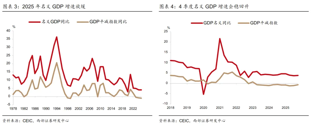 2025年名义GDP增速放缓,4季度企稳回升。2025年GDP平减指数同比下降1%,名义GDP同比增长4%,较2024年放缓。4季度名义GDP同比增长3.8%,较3季度同比增速3.7%回升,4季度GDP平减指数同比下降0.7%,较3季度同比跌幅1%收窄。