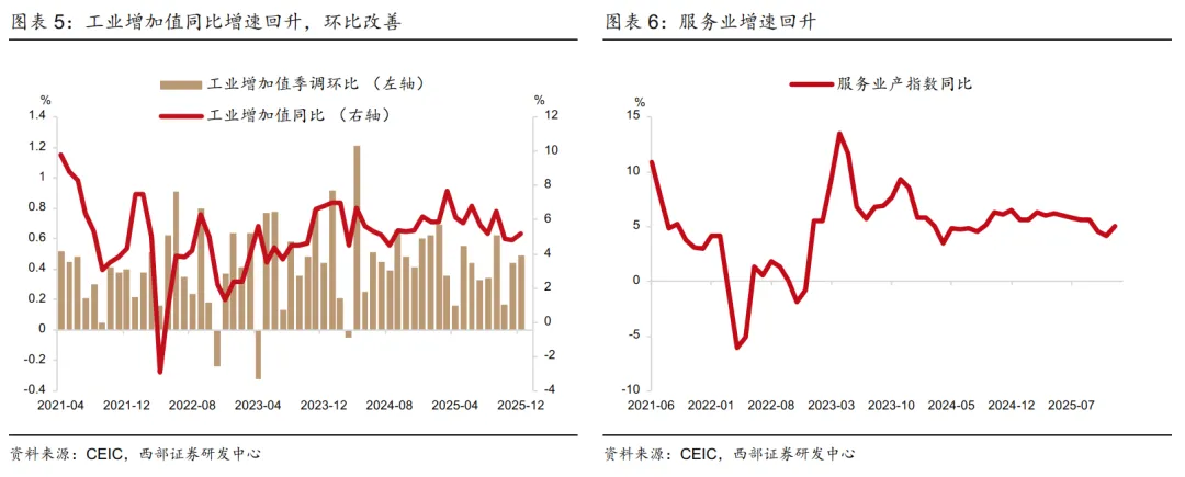 12月工业和服务业生产有所企稳。12月,工业增加值同比增长5.2%%,较11月同比增速4.8%回升;季调后环比增长0.49%,也比11月0.44%加快。12月,服务业生产指数同比增长5%,较11月同比增速4.2%回升。4季度整体看,工业增加值和服务业生产指数同比增速都比3季度放缓。