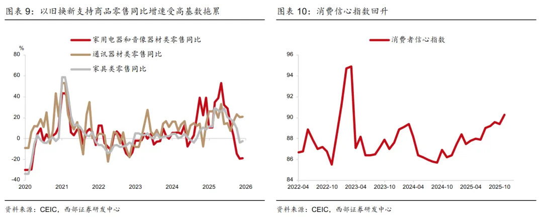 2025年零售增速回升,消费信心指数有所回升。12月份,社会消费品零售同比增长0.9%,较11月增速1.3%放缓。其中,商品零售同比增长0.7%,餐饮收入同比增长2.2%,都比11月放缓。“以旧换新”支持的家电和家具零售受高基数拖累,同比增速仍然为负。但消费者信心指数持续回升,11月回升至90.3。2025年零售同比增长3.7%,较2024年增速3.5%略有回升。