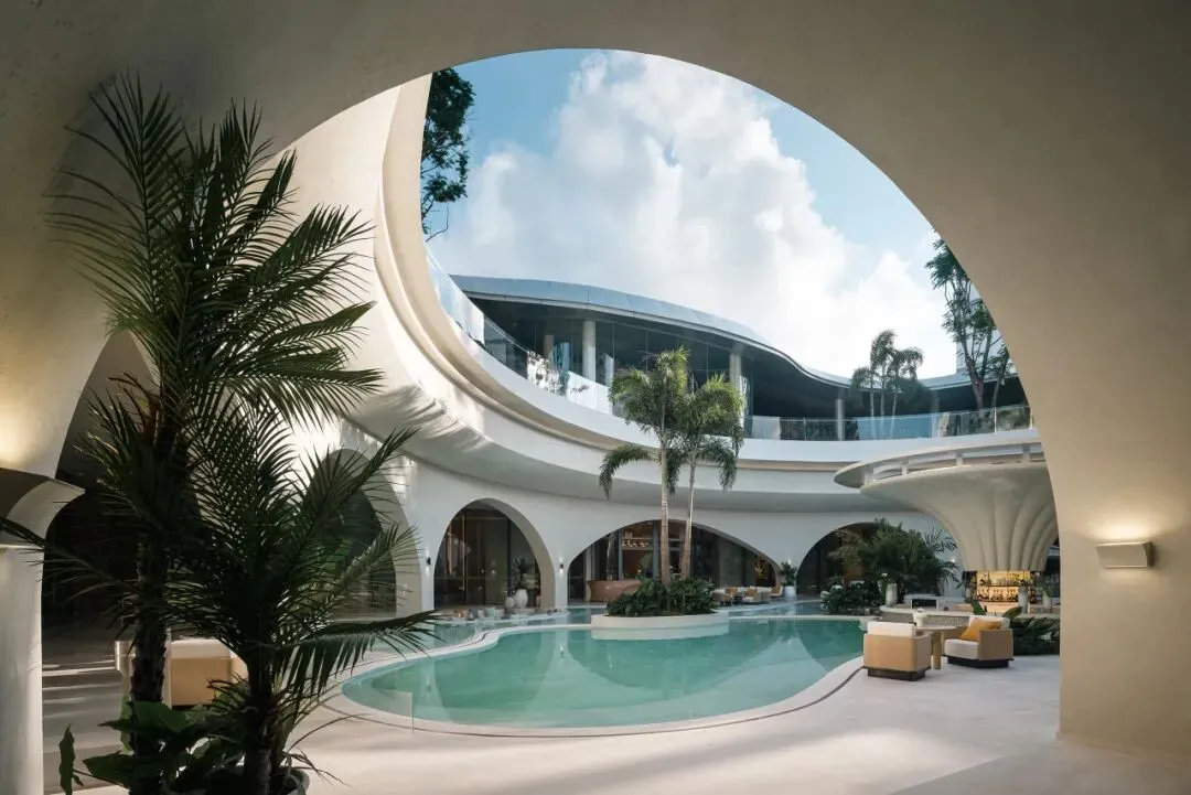 立足海棠湾度假属性,以低密高层布局与开放式公共空间,重塑“回归度假本质”的居住体验。曲线立面、下沉会所与270°全景阳台,让建筑与自然景观充分融合。