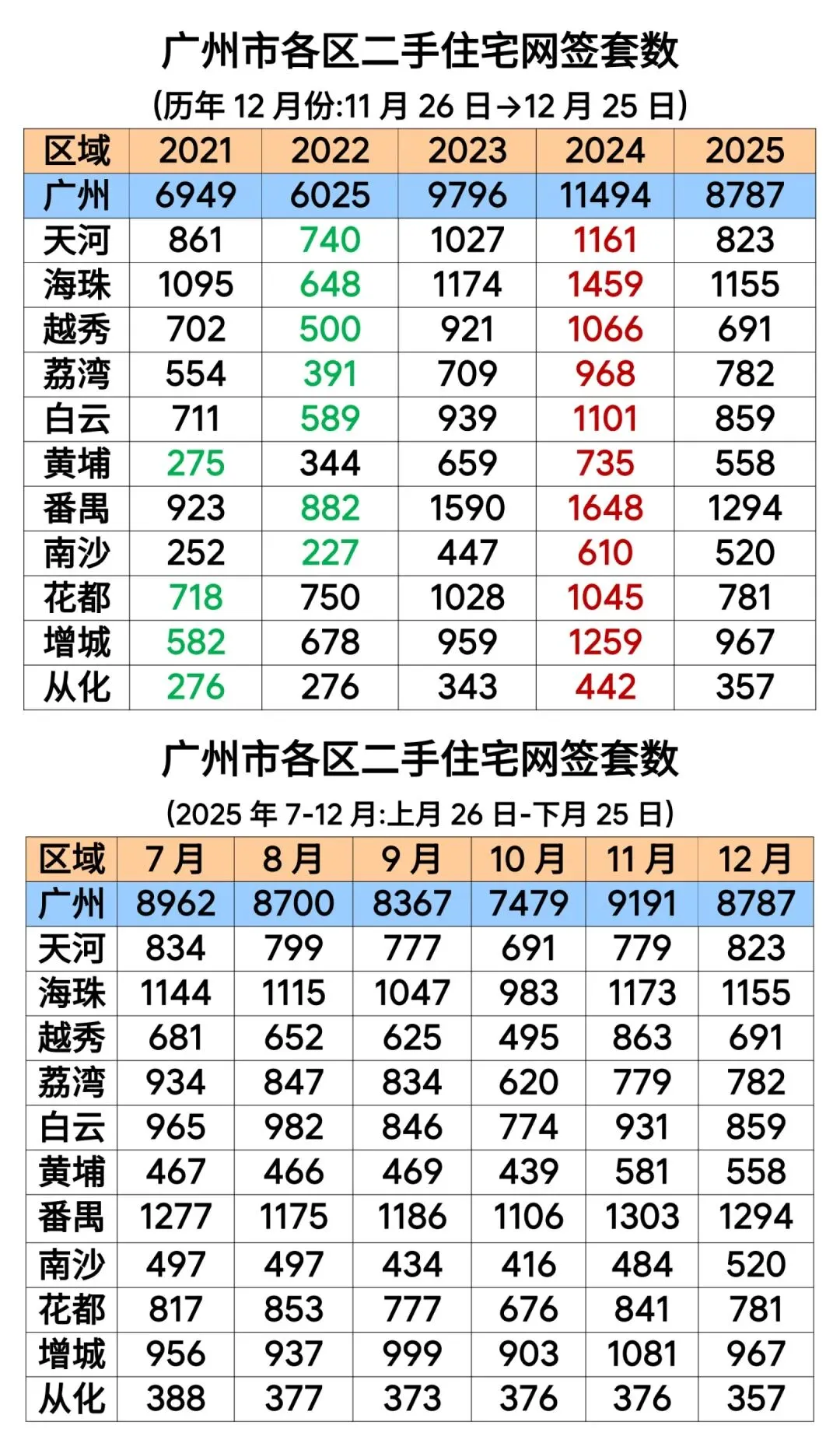 2025年12月(统计周期:2025年11月26日至2025年12月25日,广州市二手住宅共网签8787套、87.60万平方米,环比分别下降4.40%和4.23%。(包含商业、办公项目)