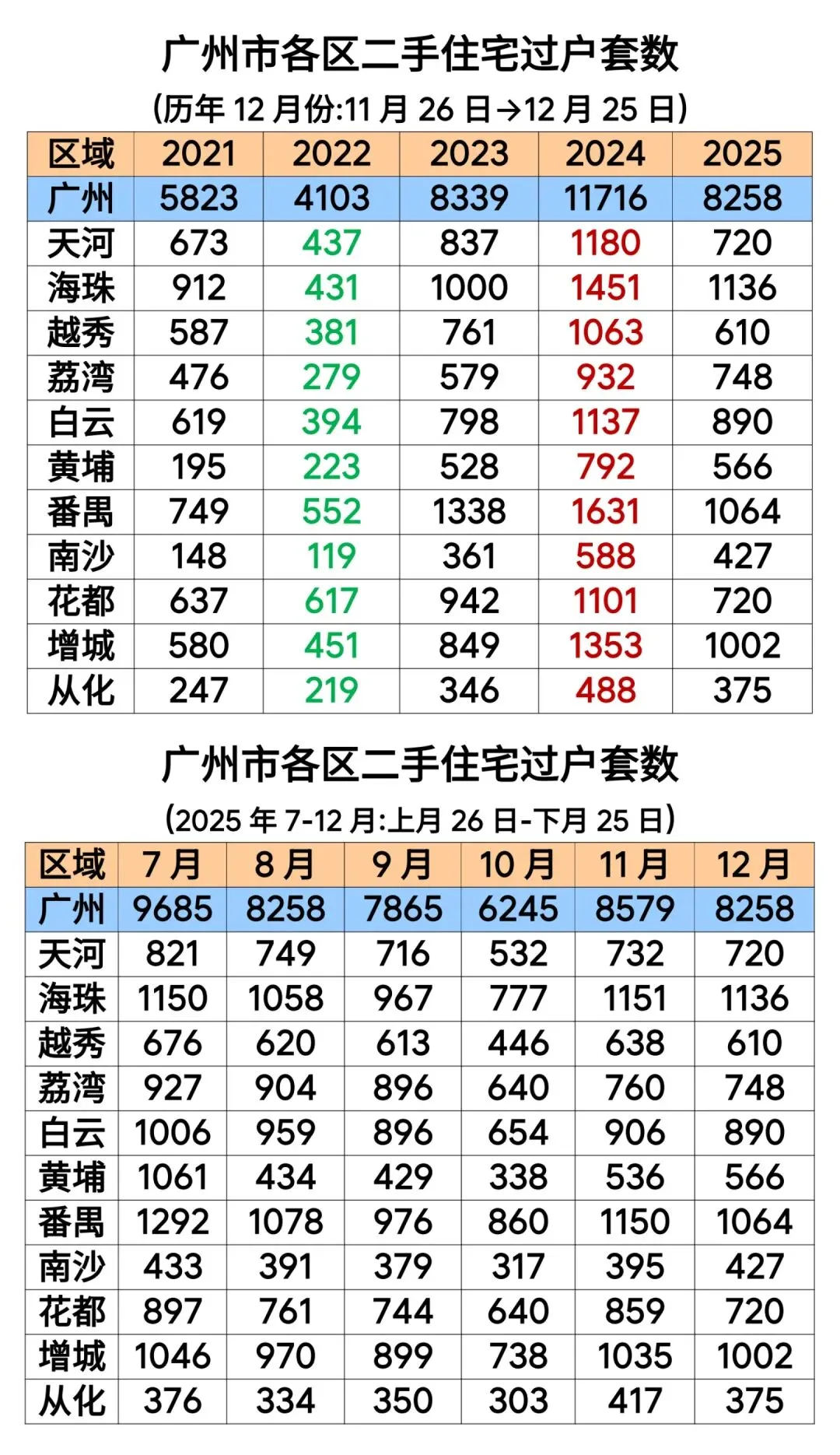 2025年12月(统计周期:2025年11月26日至2025年12月25日),广州市二手住宅交易登记宗数和面积为8258宗和79.52万平方米。(商业、办公未纳入统计)