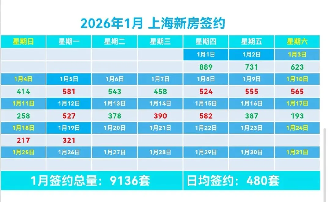 🏠1月上海新房总签约9136套,日均签约480套,本月签约总面积60.85万m²,套均面积69.55m²。