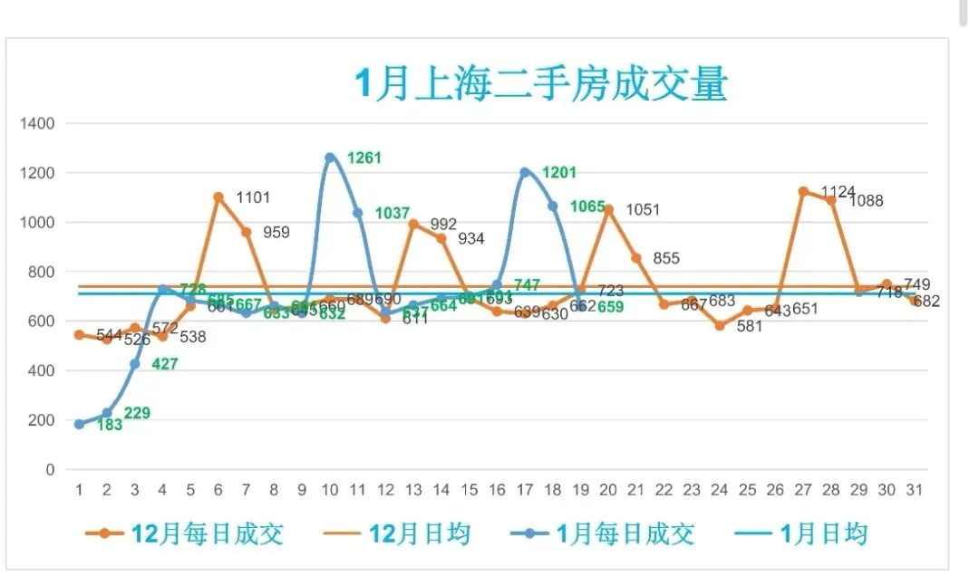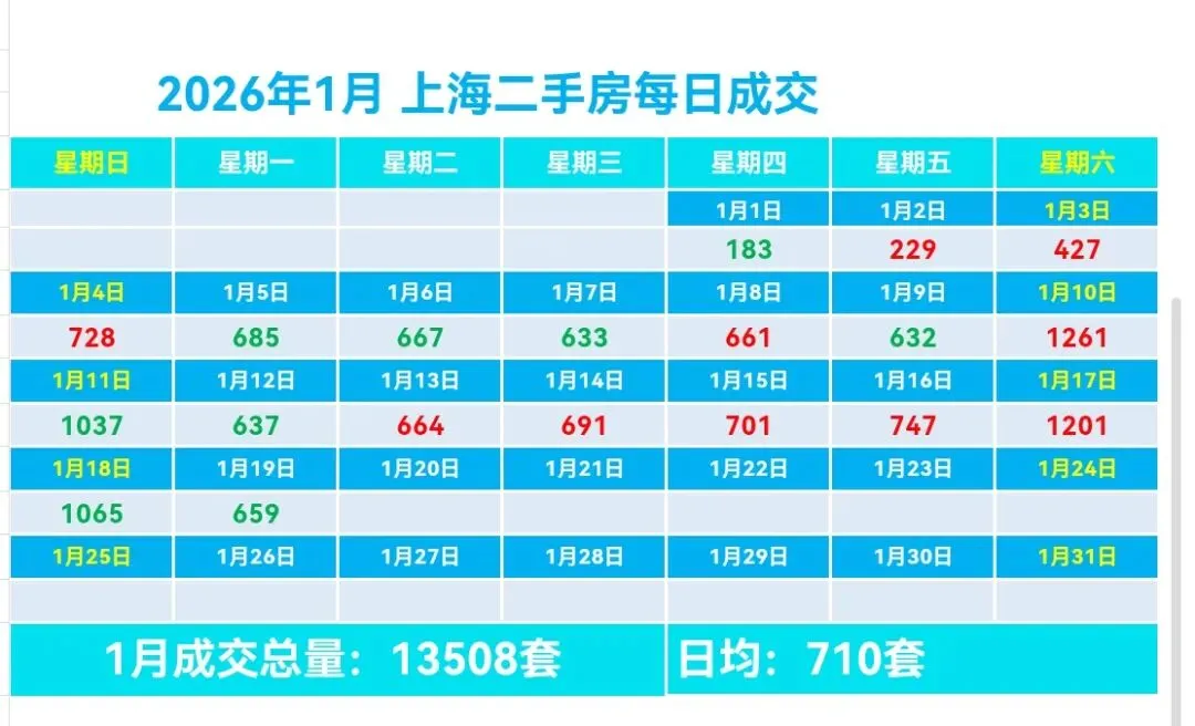 🏡1月,上海二手房成交量累计13508套,日均成交710套,较上个月日均减少30套(降幅4.05%)。