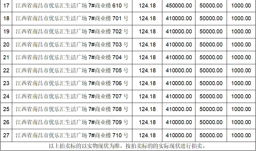 四、关于拍卖标的:本拍卖公告及竞买须知对拍卖标的房屋建筑物的建筑面积、用途、内在质量等的描述主要依据 江西优乐汇实业有限公司 管理人 提供的相关资料作为依据 。拍卖标的 以实际现状 为准,按拍卖标的的实物现状 进行拍卖 ,拍卖标的实物状况与 本公告及竞买须知 公告 的 描述有差异的并不影响本次拍卖结果。