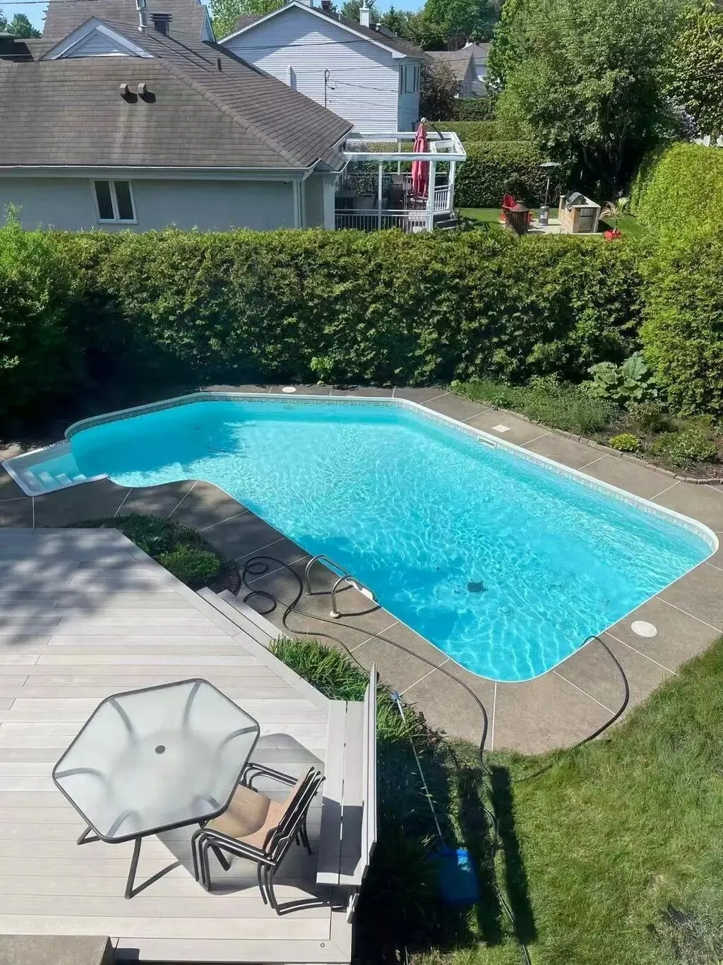 后院同样令人惊喜:大面积露台非常适合夏日聚会与休闲娱乐,地下游泳池让炎炎夏日充满度假般的惬意体验。