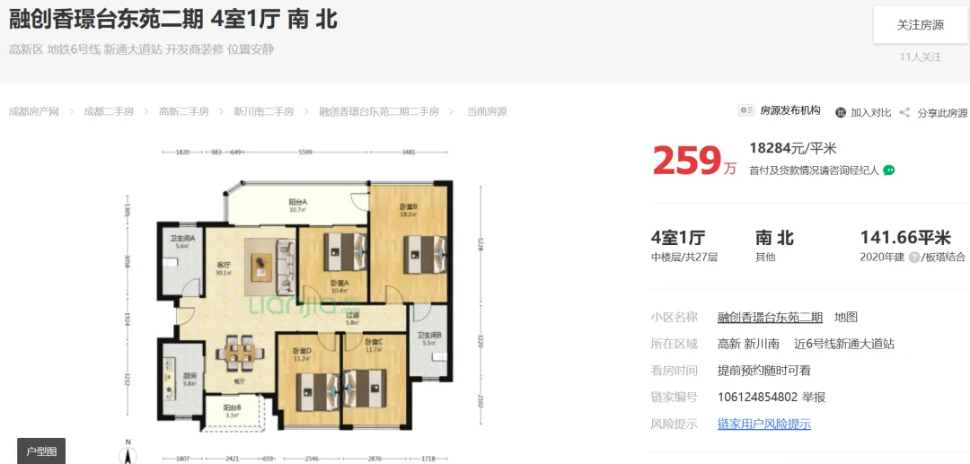 2026年01月19日,据市场端消息:成都高新新川,融创香璟台东苑二期建面142平套四报价259万;目前房东心里价在259万愿意出售。