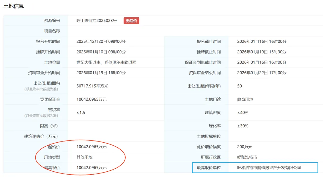 2026年1月19日,呼和浩特土地市场传来重磅消息——帅家营板块核心教育用地呼土收储挂2025023号被摘牌,买家是呼和浩特市鹏盛房地产开发有限公司,即万锦地产。