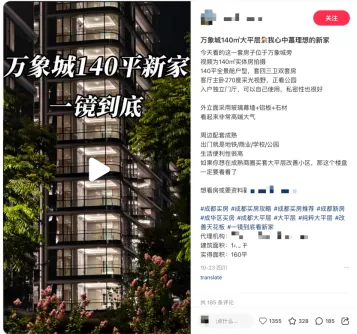 笔记通过大标题一镜到底,强化内容优势“稀缺地段 + 产品力” 精准抓改善需求地段稀缺,锁定城市核心商圈,一镜到底”强化沉浸式体验体验升级,带用户从外立面到室内空间、窗外景观,完整漫游房源,比静态图文更直观展示 “户型通透感、采光效果、窗外视野” ,降低 “购房想象误差” ,让买家身临其境感受 “理想新家” 。
