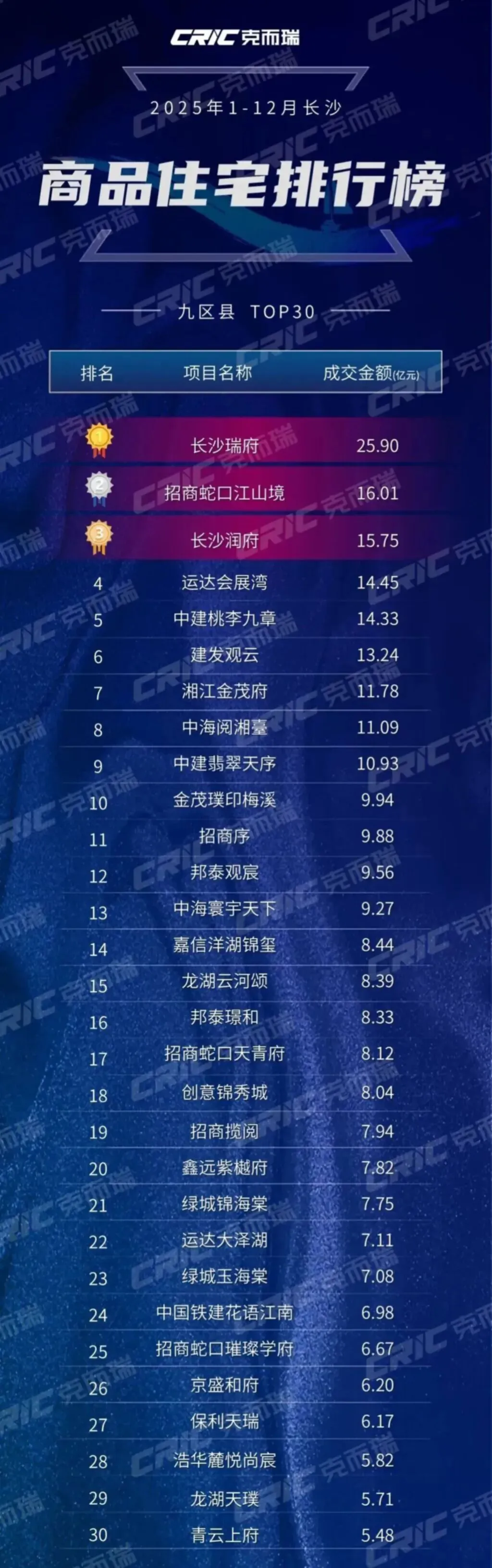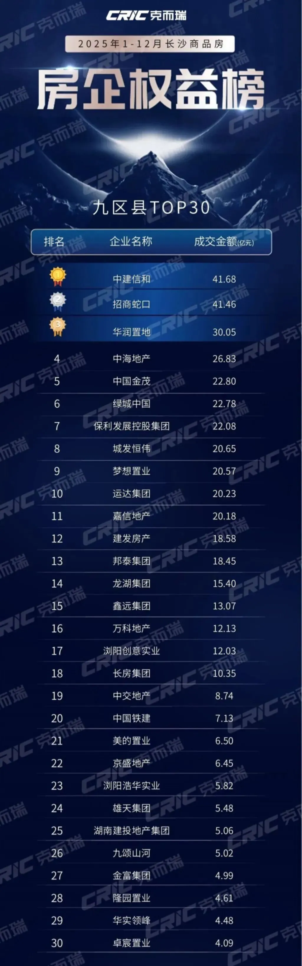 2025年,长沙房地产市场交出了一份令人瞩目的成绩单:根据克而瑞数据,TOP30房企销售额占全市新房总成交额的74%。这意味着,每100元购房款中,有74元流向了这30家头部企业。