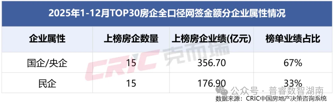 尽管国央企仍是长沙楼市的“压舱石”,但民企的崛起正悄然改变市场格局。2025年,TOP30房企中国央企业绩占比虽仍高达68%,但民企数量已实现反超,且业绩占比持续提升。