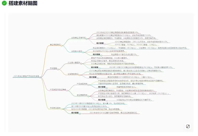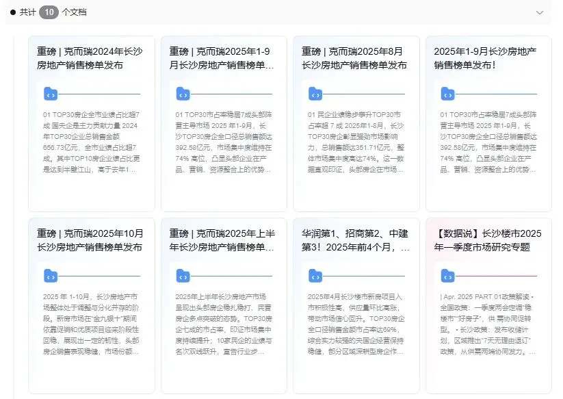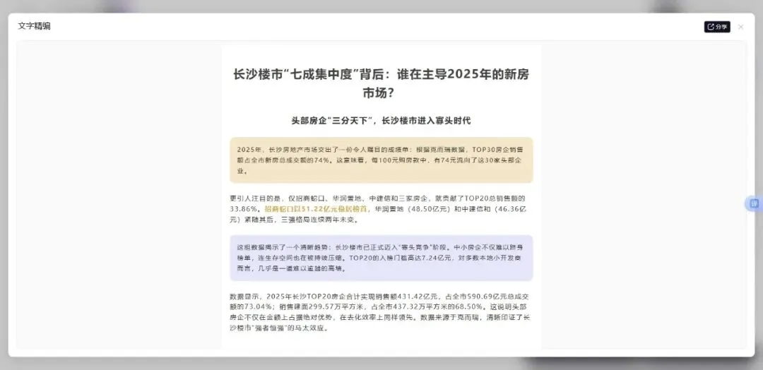克而瑞·深度智联是地产人的“第二大脑”,房地产行业的首个AI AGENT。它不仅会思考分析,还会提供工作成果,擅长处理您工作中各种场景的任务,可以帮您完成多个复杂工作,是您最佳的AI助手。 头部房企“三分天下”,长沙楼市进入寡头时代