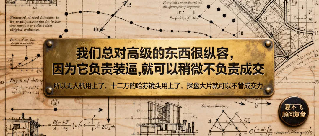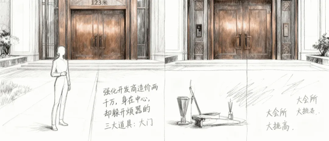 我统计过,2025年视频号豪宅探盘视频,80%都是这个套路:先30秒超级亮点(不是下沉会所,就是70米大门;不是5米挑高大堂,就是泡桐黄蜡石),然后四五个超级卖点;最后一段陈恳而惊讶的表情,深谈行业下行,居然有这样良心、匠心、初心的开发……
