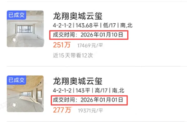 仍以龙翔奥城云玺为例,首套房成交后,进入2026年项目又陆续成交2套房,成交价格分别为19371元/㎡、17469元/㎡,虽说楼栋、楼层位置不同,但价格优势逐步减弱也是事实。